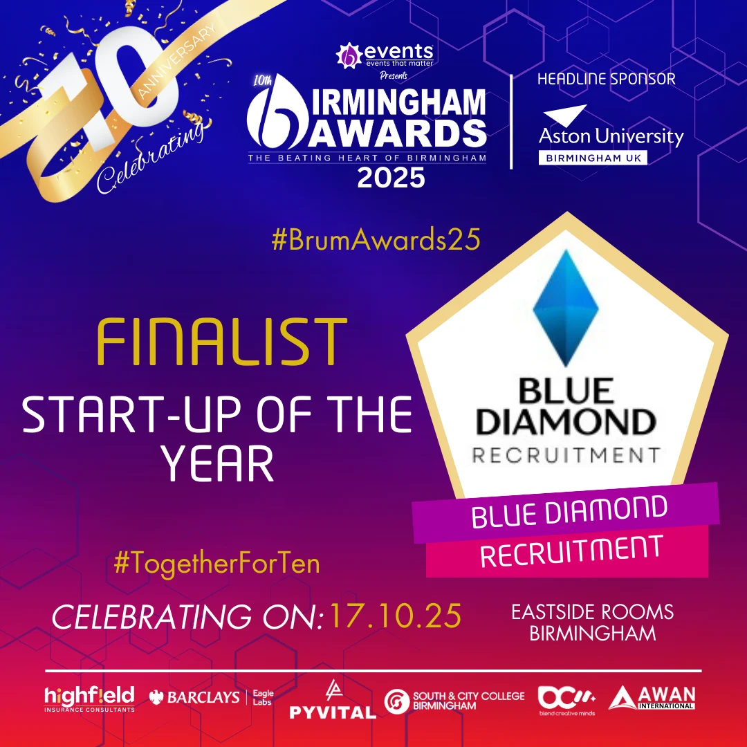 Within 12 months of launching the business, Blue Diamond Recruitment were proud to win Start Up Business of the Year at the Birmingham Awards! Daniel and Amy were recognised and rewarded for the work they are doing, both professionally and for the community. It was a competitive category to win as they were up against 11 other strong finalists, which makes this achievement even more special.